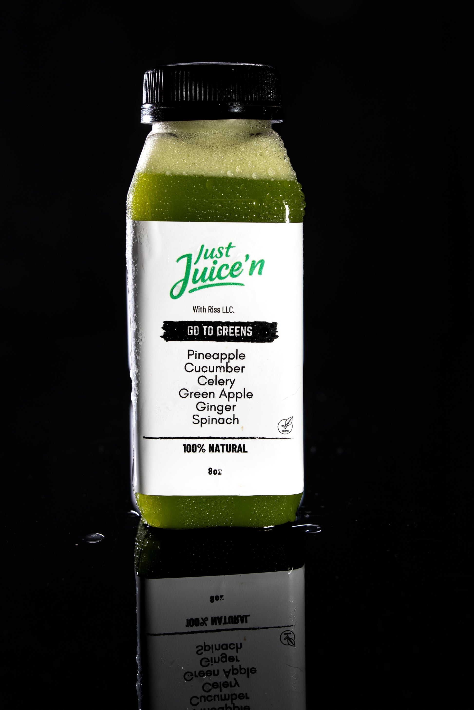 Elevate your wellness routine with our signature Go To Greens Cold Pressed Juice - a nutrient-dense that harnesses the synergistic power of 7 premium ingredients to deliver a green juice experience like no other. Crafted with a thoughtful blend of celery, spinach, cucumber, green apple, pineapple, ginger, and lemon, this vibrant green juice is packed with an abundance of fiber, vitamins A, C, and K, as well as a potent antioxidant punch to nourish your body.